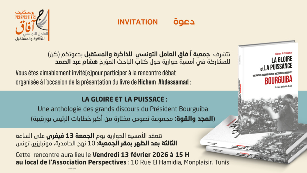 1- 1ère activité du Club de Lecture de « Perspectives » le vendredi 13 Février 2026 au local de l’association « Perspectives » au 10, rue Al Hamidia, Montplaisir, 1073, Tunis. Le livre à présenter est :